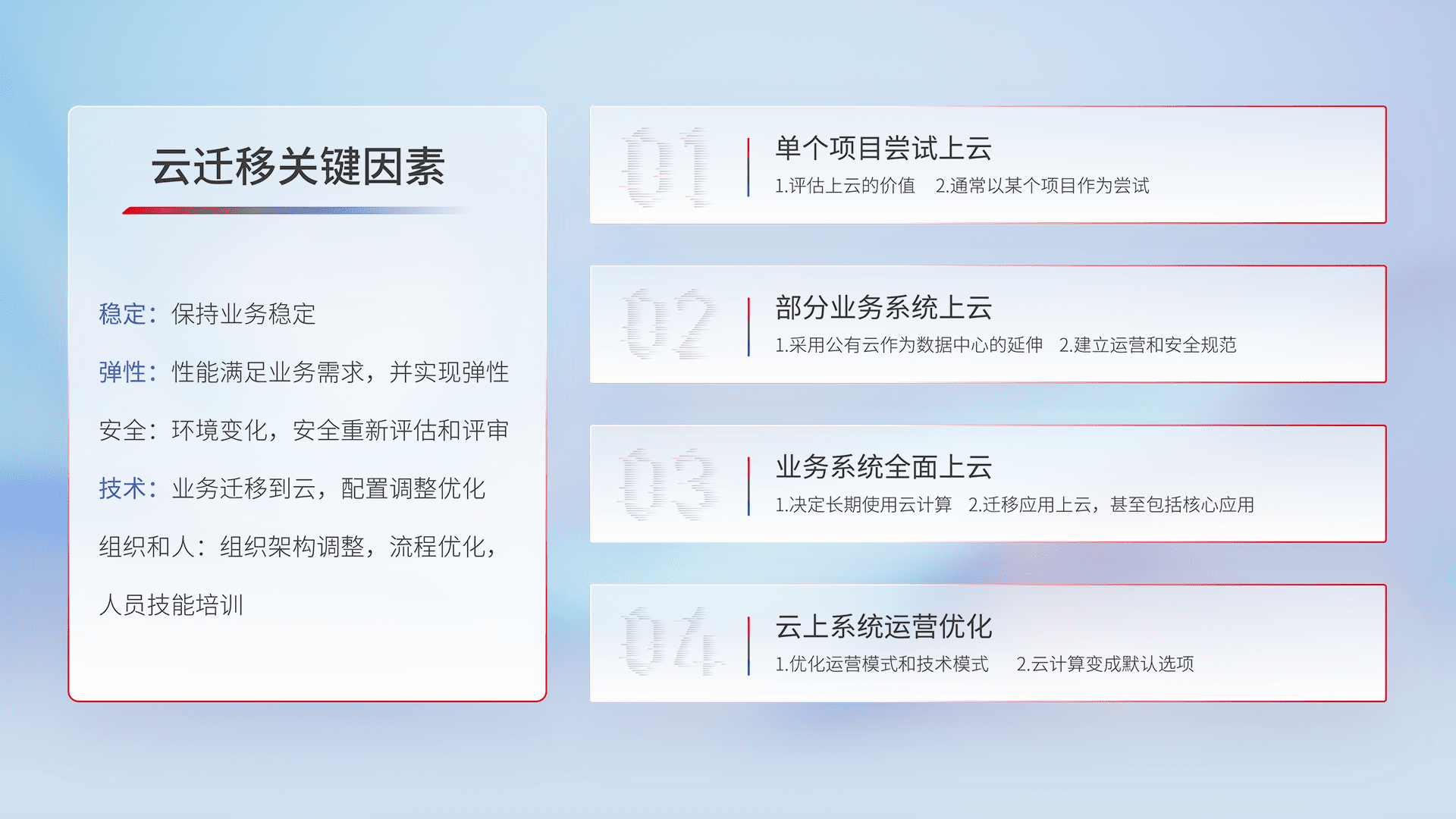 结合实际业务,,,从规划设计、、、、云平台选型、、云原生改造、、、、数据迁移、、、、集成交付,,,迁移全过程为客户识别最佳上云路径,,,做好风险识别管理,,,设计网络架构、、、身份权限、、安全审计合规、、、、操作审计、、、、日志审计、、、监控告警策略、、、、多站点容灾设计等,,,对云上基础设施进行整体规划,,,提升IT治理水平,,,,以满足弹性、、、高可用、、、高性能的需求。。。。