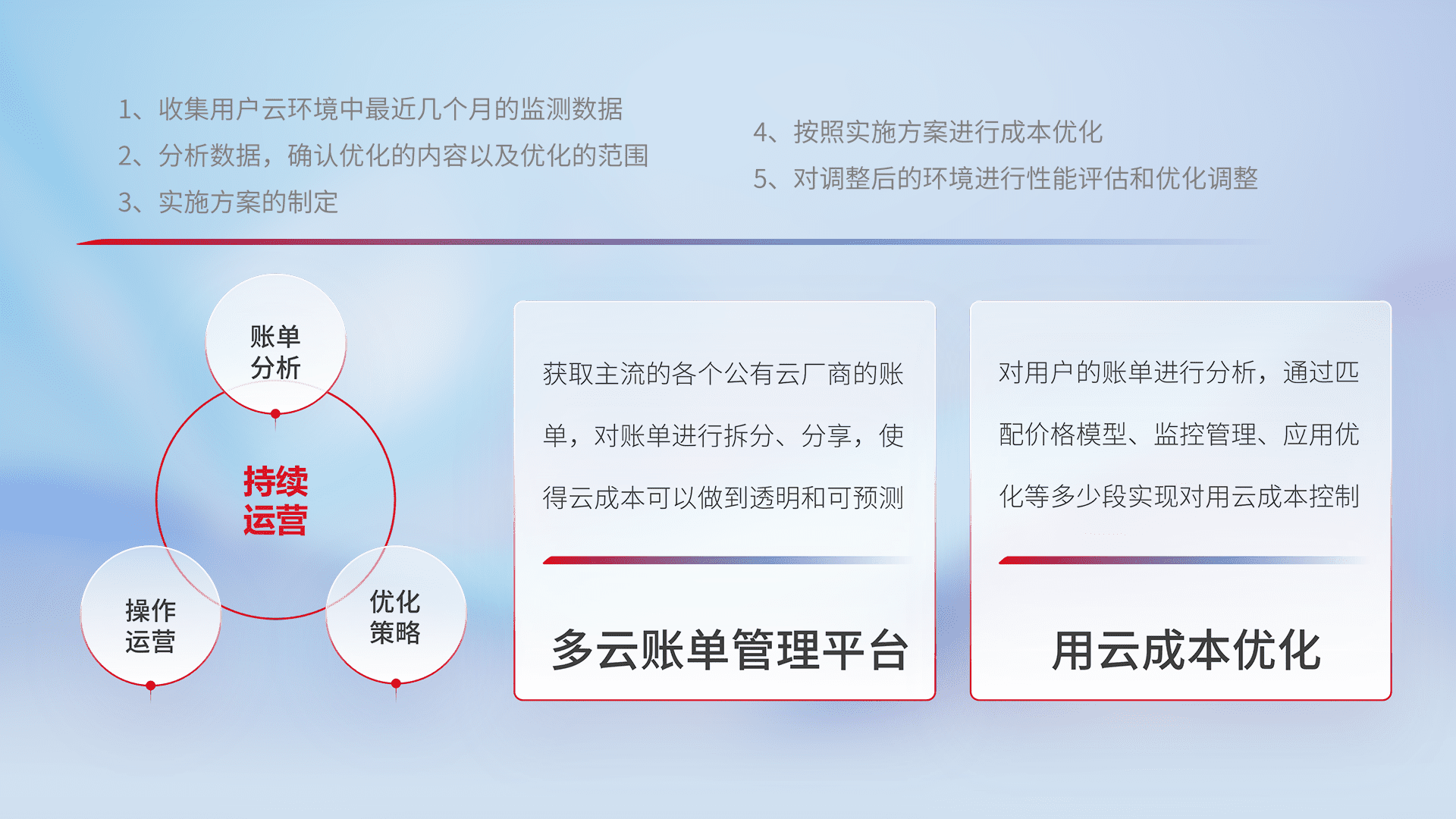 通过多云纳管,,以统一的资源数据模型把客户的云资源进行抽象和封装,,,进而实现对多云资源的统一操作,,,,保障云资源管理的可靠性、、、、稳定性与可用性。。。。量身定制化运维内容,,配置、、、开发运维、、补丁管理、、备份、、监控、、、、认证和访问管理、、、、审计和日常巡检等,,保障在用云过程中的可靠度,,,,稳定度以及高可用率。。